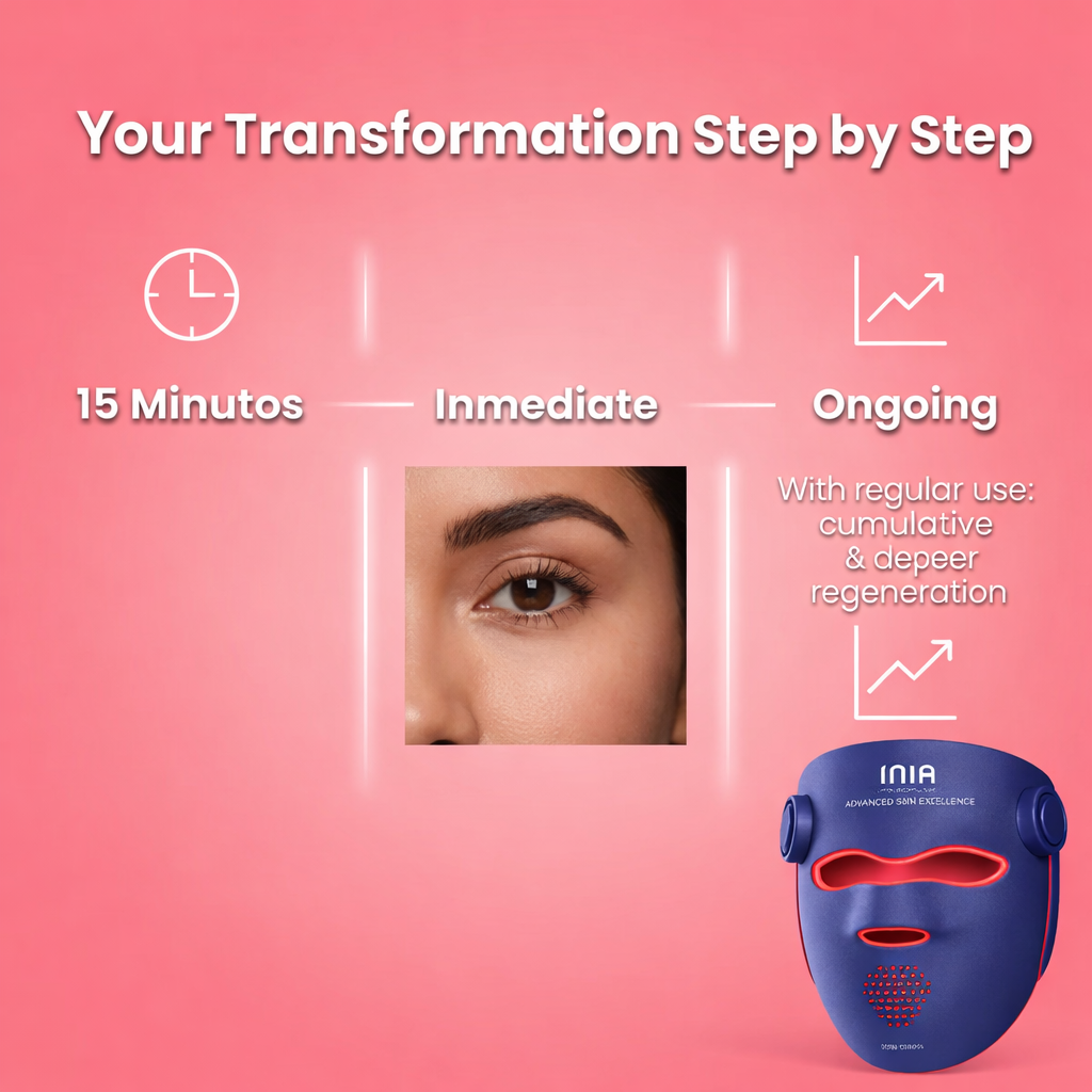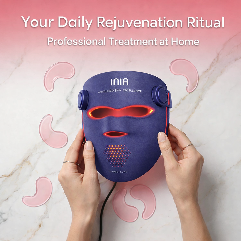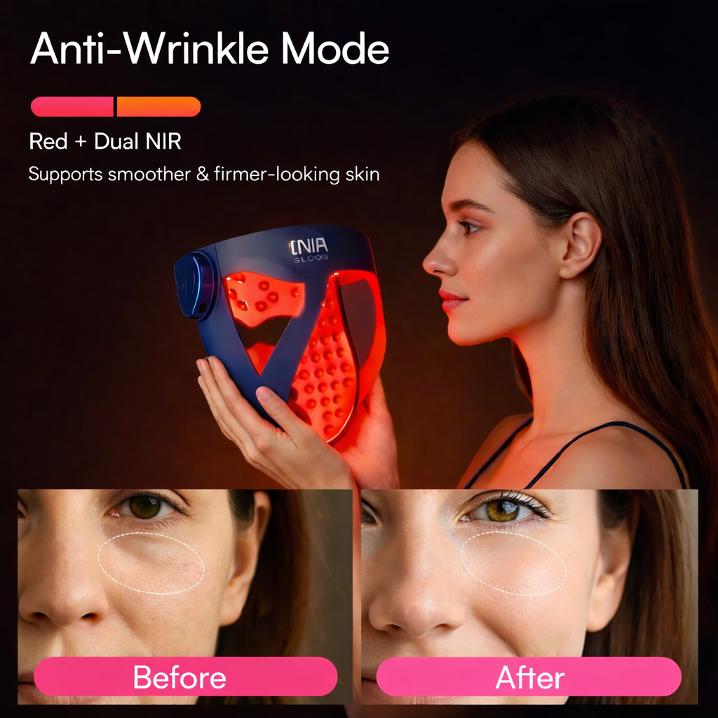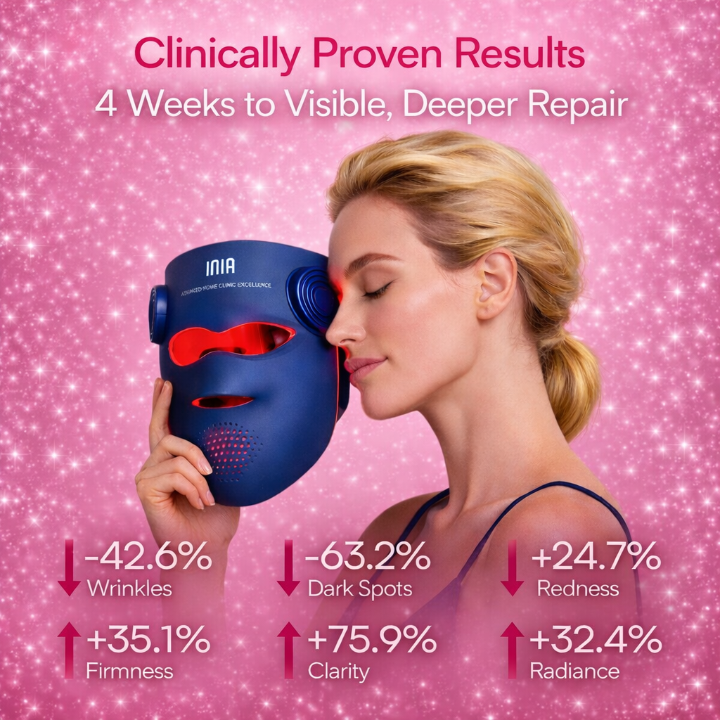 The INIA GLOW 940 – 4D LED Mask with Dual NIR 940 + 850 nm delivers professional-inspired light therapy from home, helping improve skin firmness, texture, and overall appearance without needles, downtime, or regret.